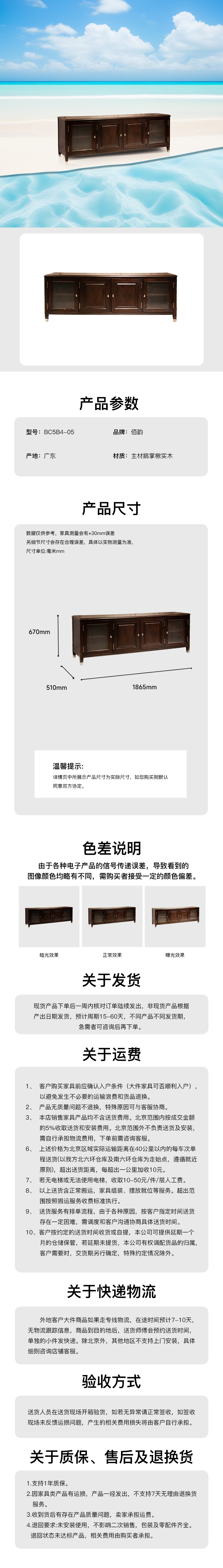 主材:*主材鵝掌楸實木 *MDF環保板(P2級美國出口標準) *超白浪紋鋼化玻璃 *鋅合金鍍鎳合頁、拉手及腳套